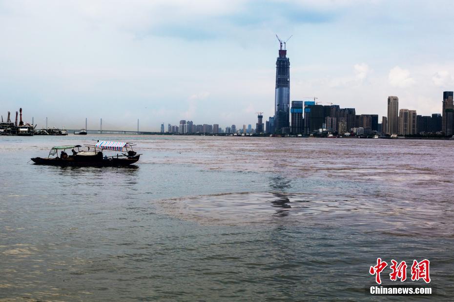 7月14日,一艘渔船停在长江和汉江交汇处,从汉阳南岸嘴望去汉江(左)与长江(右)“泾渭分明”。中新社记者 张畅 摄