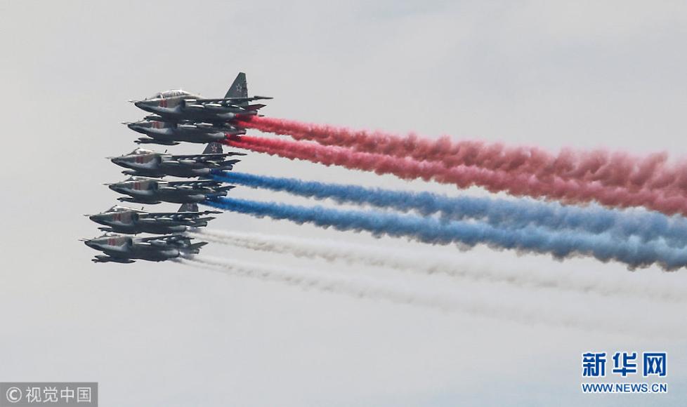 当地时间2018年8月4日,俄罗斯梁赞,2018“航空飞镖”国际军事比赛即将开幕,特技飞行队在彩排。(图片来源:视觉中国)