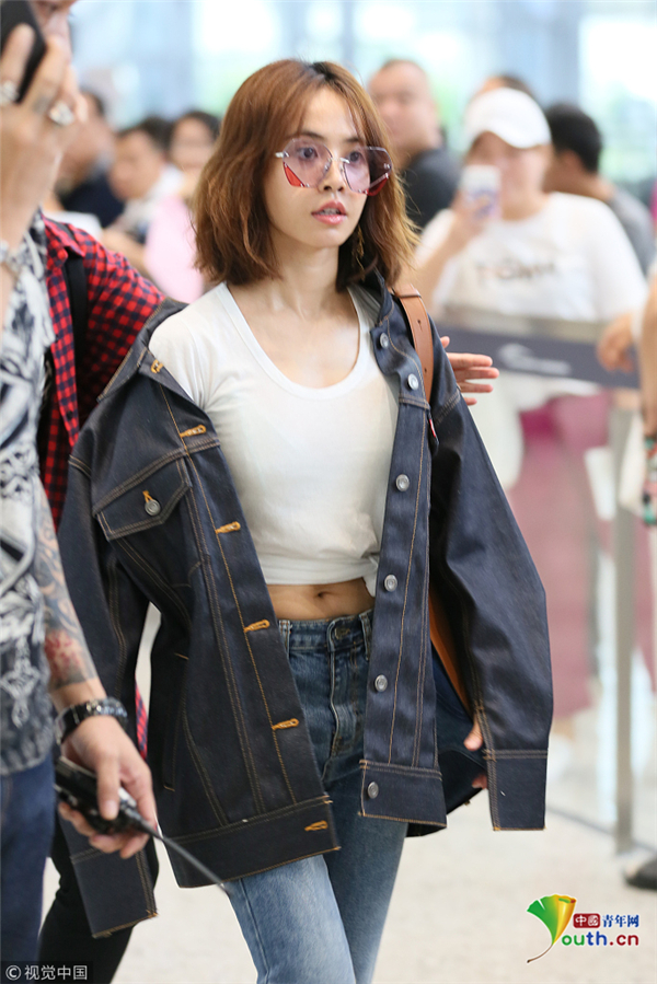 8月7日,广东省广州市,蔡依林现身广州白云机场,半披牛仔外套的她内搭白色紧身衣,小露腹部,下身穿拖地阔腿牛仔裤,一路引来频频侧目。