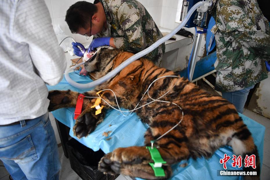 8月9日,位于昆明的云南野生动物园兽医通过呼吸麻醉的方式,为园中一只一岁的老虎清洁牙。 中新社记者 刘冉阳 摄