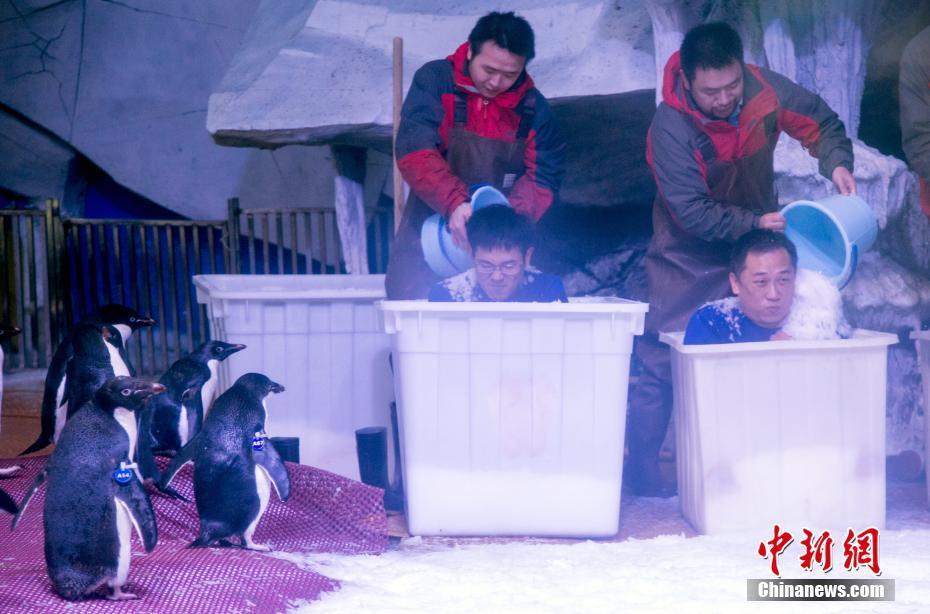 8月11日,在企鹅馆举行的决赛中,工作人员给参赛选手桶里加冰块。当日,一场充满趣味性的“冰极挑战赛”在武汉海昌极地海洋世界上演,参赛者们经过“极地初体验”和“极寒企鹅馆耐寒挑战”两个环节,坚持时间长者获胜。中新社记者张畅 摄