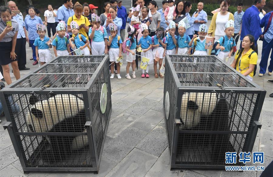 8月20日,两只大熊猫在转运笼内等待运输。