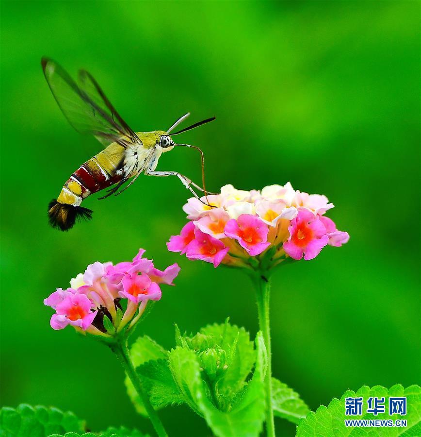 在福建省福州市温泉公园,透翅天蛾在花间飞舞(8月18日摄)。近日,福建省福州市温泉公园内的马缨丹大面积开放。花红、草绿、虫飞,构成了一幅和谐的闽都生态图景。 新华社记者梅永存摄