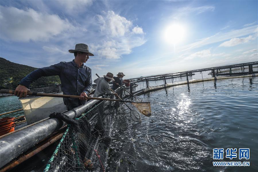 8月18日,南麂岛海域的“海上牧场”养殖区内,渔民正捕捞大黄鱼,处于仿生养殖环境的大黄鱼需要生长2至3年。进入8月,浙江省温州市平阳县南麂镇海域上大片的大黄鱼、贻贝等特色海产品养殖区域迎来丰收季节,养殖户们驾驶渔船在养殖区海域进行打捞收获,在碧海蓝天下构成了一幅“海上牧场”的美丽丰收景象。近年来,南麂镇政府引导渔民养殖户充分发挥“靠海吃海”的资源优势,大力发展海洋养殖经济和海岛旅游经济,实现了南麂由“生态美”向“产业美”,“产业美”向“经济美”的转变。同时该镇坚持以大黄鱼、贻贝等为特色产业支撑,精准发展高效海洋养殖业,重点培养一批新型职业渔民,依靠专业技术支持,实现深海仿生养殖,让好生态造就好品质,重点打造南麂养殖品牌,组建营销网络,拓展特色海产品市场。新华社记者 徐昱摄