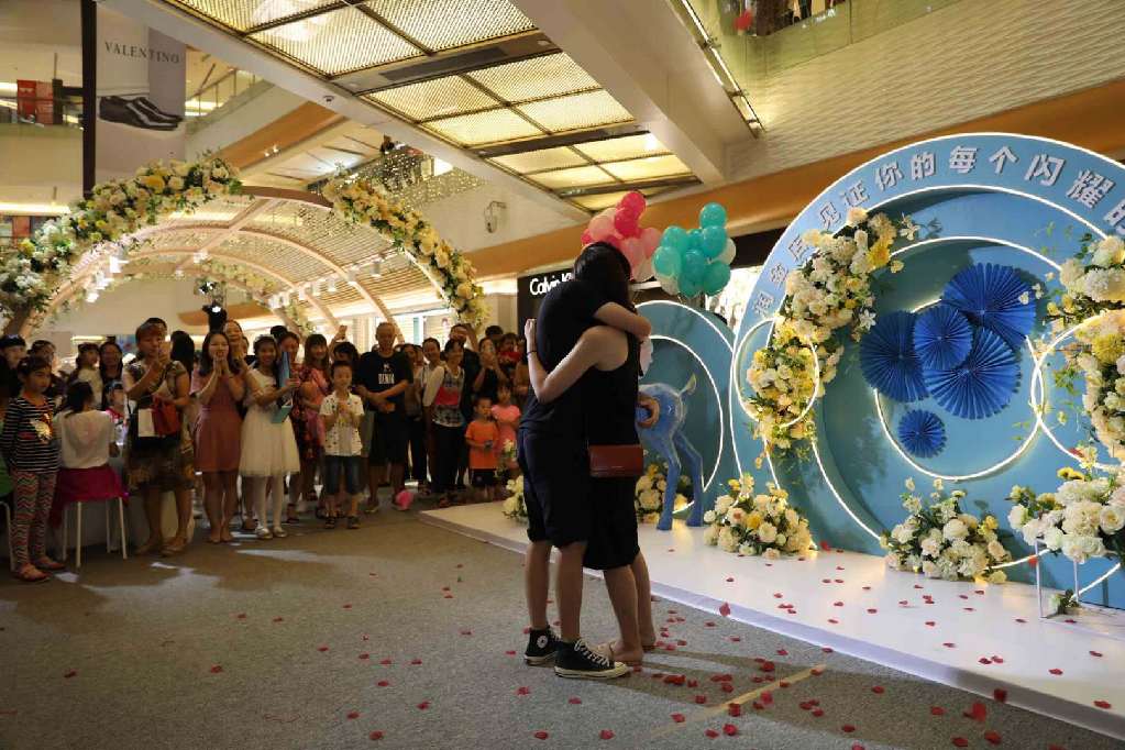 开幕式当天,润金店工作人员还配合市民杨先生上演了一场浪漫的“求婚大作战”。原来,数日前,杨先生到润金店表示要买一枚与众不同的戒指向女友求婚。在销售顾问的建议下,杨先生选购了一枚蓝宝石戒指作为求婚信物。得知杨先生的心意后,润金店品牌策划部决定与杨先一起在七夕当天完成这场浪漫的“求婚大作战”。当天,杨先生带着毫不知情的女友来到润金店“炫出色彩 耀你不凡”VIP品鉴会现场。正当女友全神贯注欣赏小提琴、拉丁舞等开幕式表演节目时,杨先生从兜里掏出事先准备好的蓝宝石戒指,单膝跪地向一脸茫然的女友喊:“嫁给我吧。”此时,开幕式现场背景音乐“配合”地换成了甜蜜的《今天你要嫁给我》。感动得热泪盈眶的女友在围观市民的欢呼中,拉起了杨先生,并答应了他的求婚。围观市民表示“七夕不过是路过,却不料狠狠地吃了一把狗粮。”