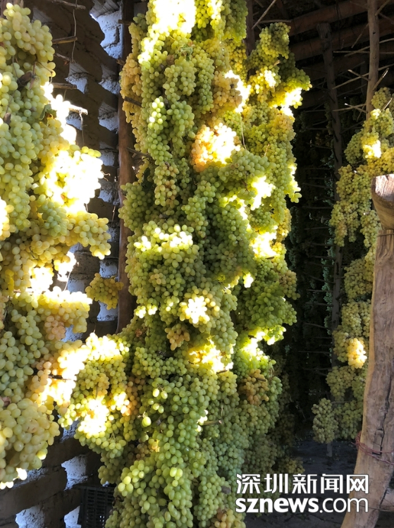镂空的土砖房具有良好的通透性,把葡萄搭在干树枝上一层层码起来高达屋顶,慢慢就会失去水分自然晾成葡萄干了。赵春丽摄