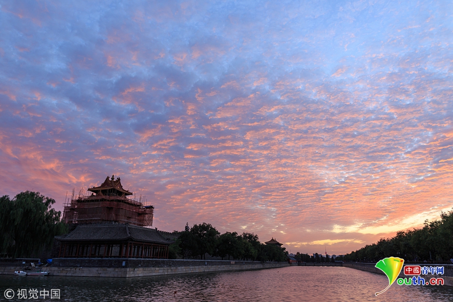 2018年9月5日,北京迎晴好天气,傍晚时分,落日晚霞美不胜收。天空出现美丽的火烧云,映照故宫博物院角楼。图片来源:视觉中国