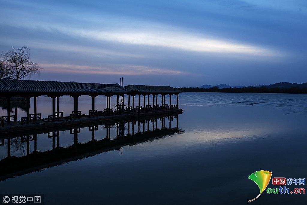 2018年2月23日,北京颐和园。当天日落时分昆明湖上空出现夕阳余晖的美景,梦幻般的色彩将古老的皇家园林装扮得美轮美奂,让人流连忘返。来源:视觉中国