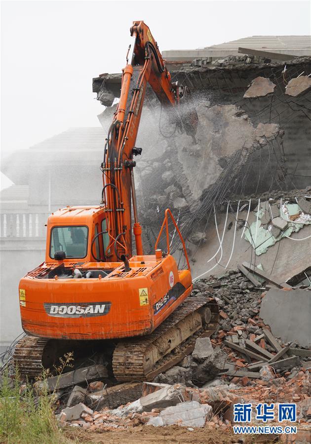 8月14日,大型机械对西安市鄠邑区蒋村镇的违建别墅进行拆除。