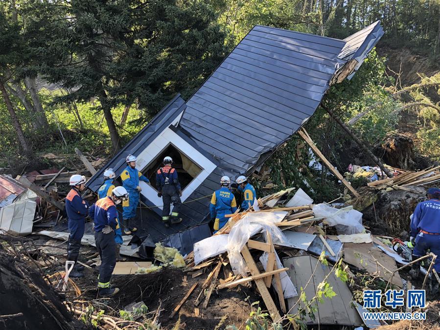 9月6日,在日本北海道厚真町,救援人员在一处倒塌的房屋附近搜救。