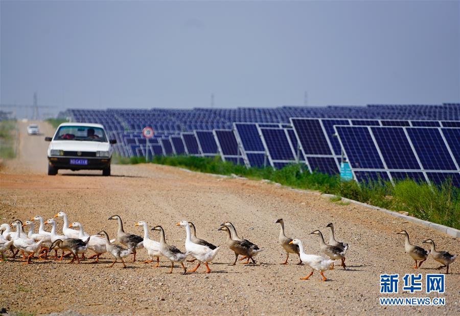 这是内蒙古鄂尔多斯市杭锦旗库布其沙漠生态太阳能光伏光热治沙发电综合示范地(8月1日摄)。“板上发电、板下种草、板间养殖”,目前该太阳能发电项目治沙面积达到了13.3平方公里,每年发电5亿千瓦时,实现销售收入4.5亿元。其社会效益、生态效益、民生效益、经济效益十分显著。 巍巍阴山南麓,鄂尔多斯高原之北,横卧着一条长约400公里、宽5-65公里的黄色“长龙”。它似弓弦,将滔滔黄河拉出一个大大的“几”字弯。 这是中国第七大、也是距北京最近的沙漠——库布其沙漠,曾经寸草不生,风沙肆虐,被称为“死亡之海”。 几十年来,库布其人一代接着一代干,书写了一部荒漠化治理的英雄史诗。 新华社记者 邢广利 摄