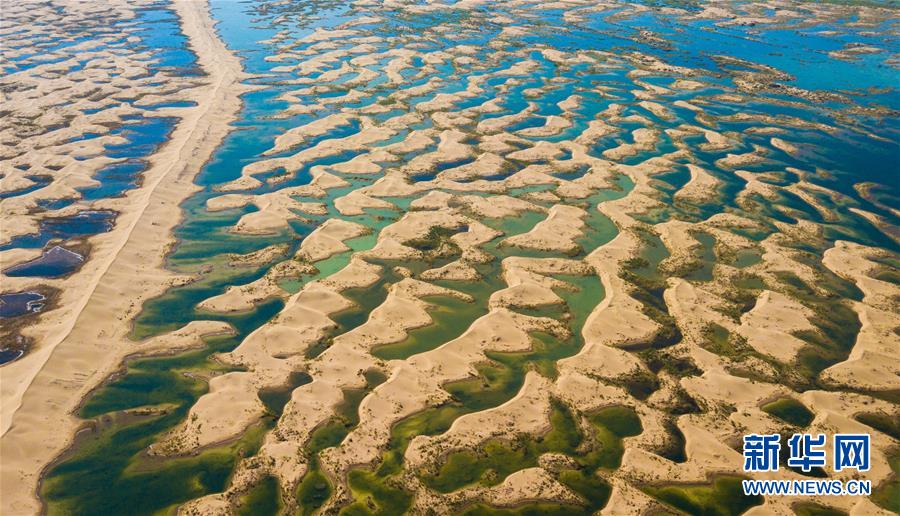 在内蒙古鄂尔多斯市杭锦旗境内的库布其沙漠腹地,由凌汛期的黄河水汇聚而成的湿地在日光照射下显示出绚丽多彩的颜色(6月9日无人机拍摄)。