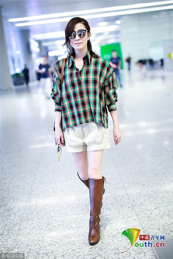 2018年9月9日,“娴妃”佘诗曼从上海机场飞往北京机场,她摆“剪刀腿”大方任拍,身穿格纹衬搭配衫灯笼裤,时髦青春衣品超赞!