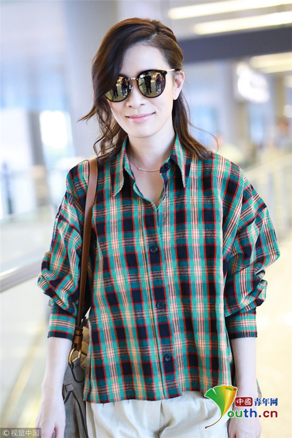 2018年9月9日,“娴妃”佘诗曼从上海机场飞往北京机场,她摆“剪刀腿”大方任拍,身穿格纹衬搭配衫灯笼裤,时髦青春衣品超赞!