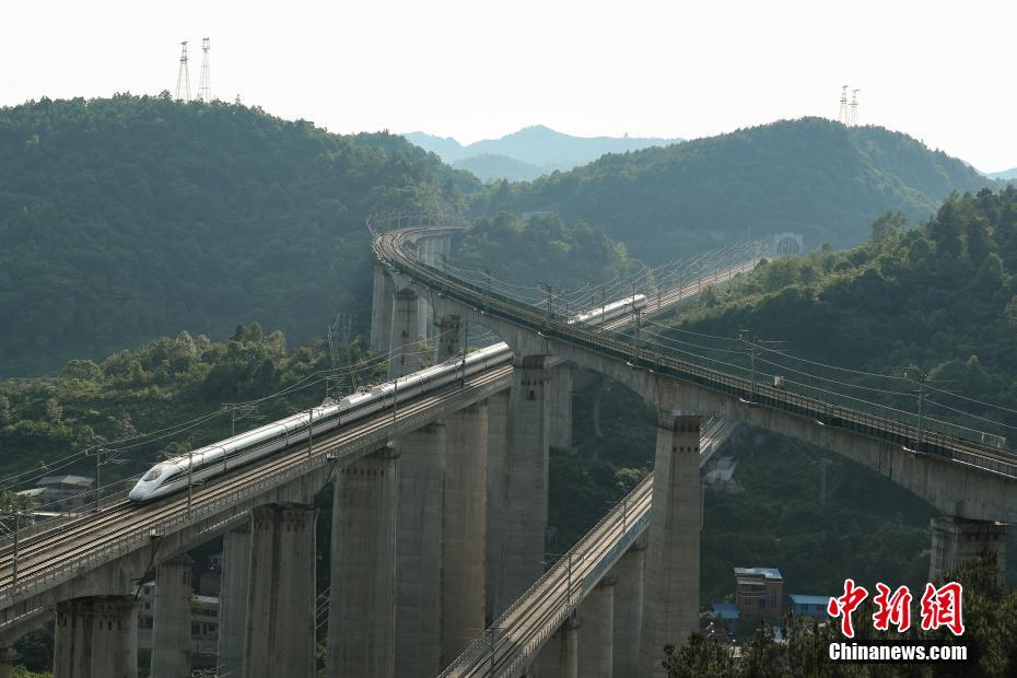 5月16日,一列动车从贵阳市郊交织的桥梁上驶过。贵州省地处中国西南腹地,高原山地居多,因此高铁建设的桥隧占比较高。在贵阳市乌当区新添寨,高铁沪昆线、贵广客运专线、贵开城际客运专线的隧道和桥梁交织在一起,形成“五洞五桥”并行。中新社记者贺俊怡 摄