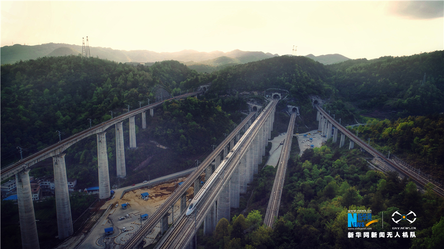 贵州省地处中国西南腹地,全省高原山地居多,因此高铁建设的桥隧占比较高。在贵阳市乌当区新添寨,高铁沪昆线、贵广客运专线、贵开城际客运专线的隧道和桥梁交织在一起,形成“五洞五桥”并行,形似“五龙出海”的壮观景象(3月29日摄)。新华网卢志佳 摄