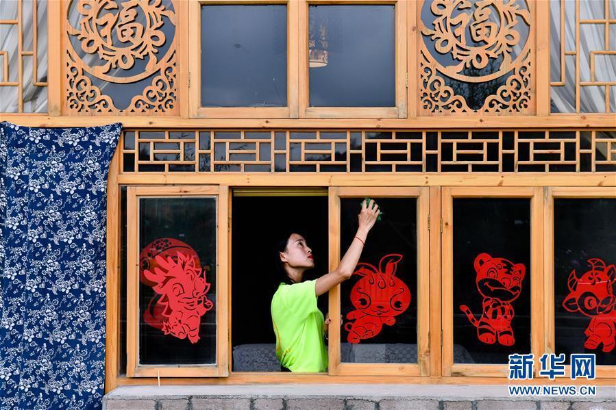 在宁夏固原市西吉县吉强镇龙王坝村,一名服务员在“窑洞宾馆”擦玻璃(8月30日摄)。