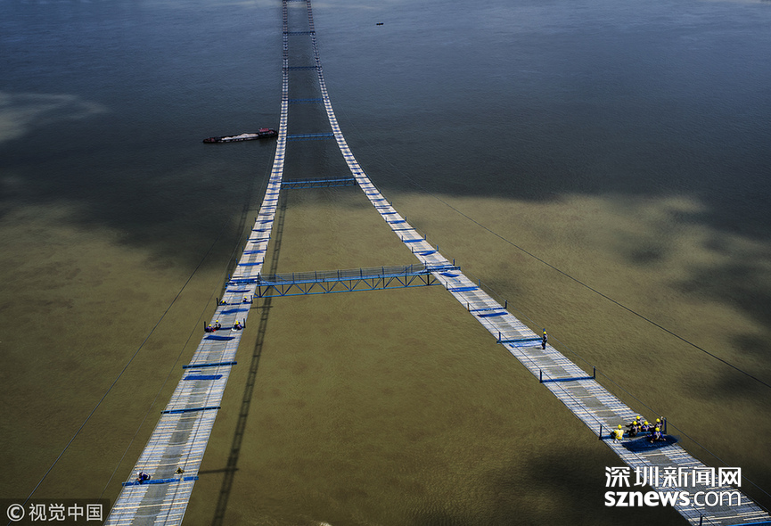 猫道是悬索桥施工时架设在主缆之下、平行于主缆的线形临时施工便道,是主缆系统乃至悬索桥整个上部结构的施工高空脚手架平台,作为极其重要的临时施工设施,大桥竣工后被拆除。