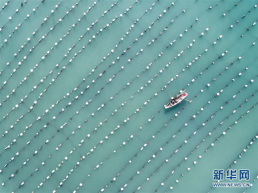 8月18日,南麂岛马祖岙海湾内,养殖户乘船在贻贝养殖区内作业(无人机拍摄)。进入8月,浙江省温州市平阳县南麂镇海域上大片的大黄鱼、贻贝等特色海产品养殖区域迎来丰收季节,养殖户们驾驶渔船在养殖区海域进行打捞收获,在碧海蓝天下构成了一幅“海上牧场”的美丽丰收景象。近年来,南麂镇政府引导渔民养殖户充分发挥“靠海吃海”的资源优势,大力发展海洋养殖经济和海岛旅游经济,实现了南麂由“生态美”向“产业美”,“产业美”向“经济美”的转变。同时该镇坚持以大黄鱼、贻贝等为特色产业支撑,精准发展高效海洋养殖业,重点培养一批新型职业渔民,依靠专业技术支持,实现深海仿生养殖,让好生态造就好品质,重点打造南麂养殖品牌,组建营销网络,拓展特色海产品市场。新华社记者 徐昱摄