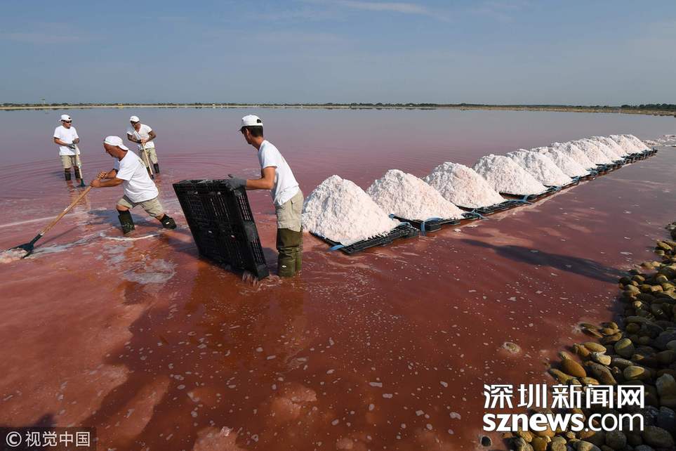 深圳新闻网讯 法国艾格莫特,工人们在盐滩收集盐晶体,那里的盐场面积达1万公顷。在收获了手工海盐“盐之花”之后,他们必须等到九月份才能收获用作食盐的盐。“盐之花”是世界上最昂贵的盐之一(100g价格可达数千元)。