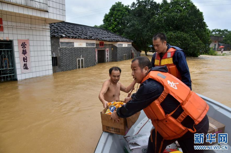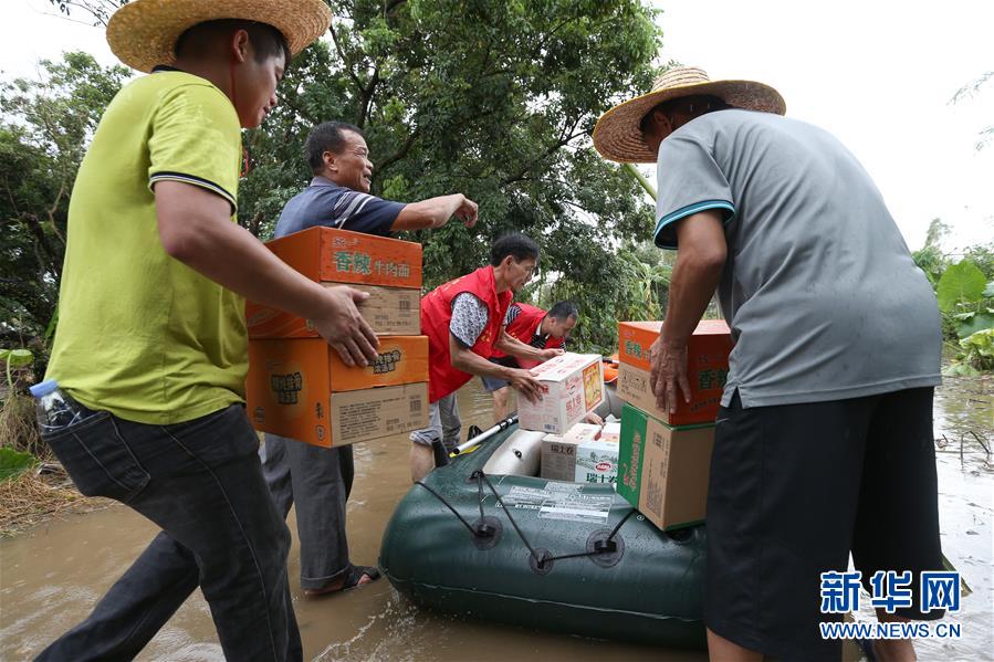 9月18日,在广东省阳江市阳春市,人们把食物搬运到筏子上,准备分发给受困村民。 新华社记者张加扬摄