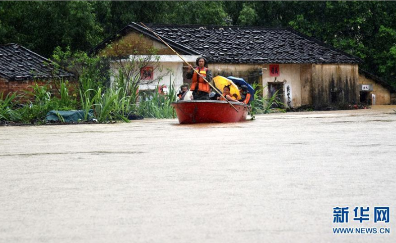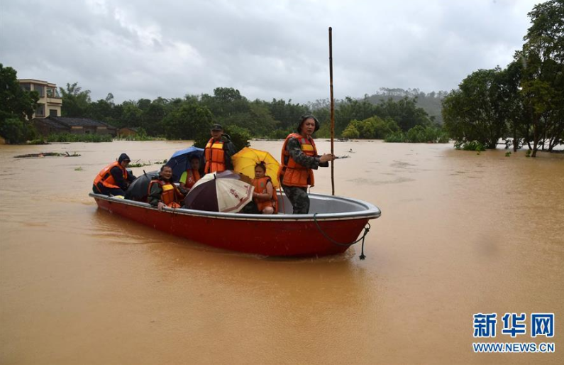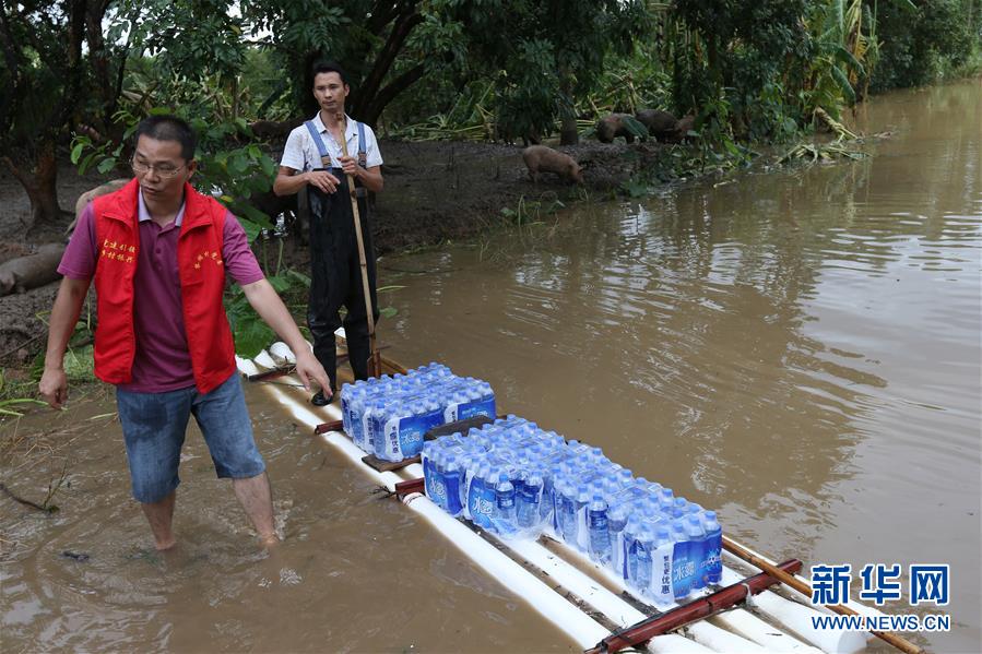 9月18日,在广东省阳江市阳春市,人们用筏子运送饮用水。 新华社记者张加扬摄