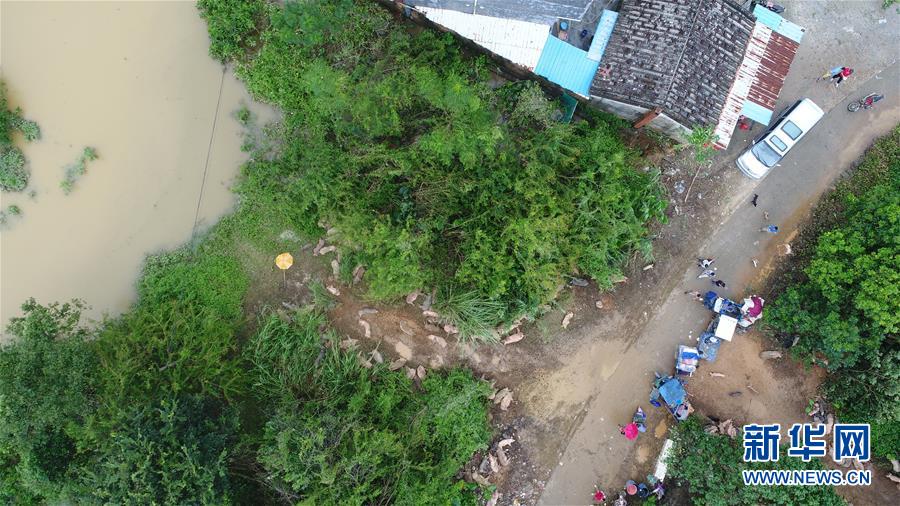 9月18日,在广东省阳江市阳春市,村民将家畜转移到高处(无人机拍摄)。 新华社记者张加扬摄