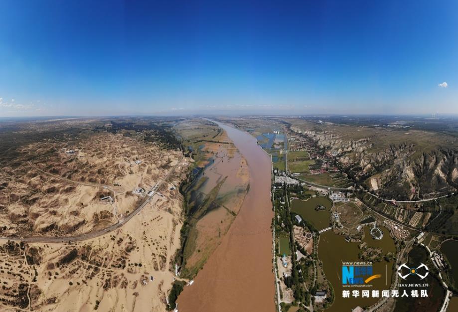 航拍黄河托克托段两岸风光,一边是鱼米之乡,一边是浩瀚沙漠。新华网 张伟 摄