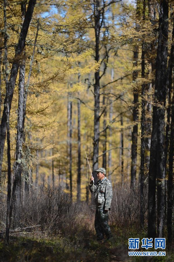 9月18日,在内蒙古大兴安岭根河林业局约安里林场,林场职工廉立臣与其他林场职工通过对讲机沟通寻找驯鹿的情况。新华社记者邹予摄