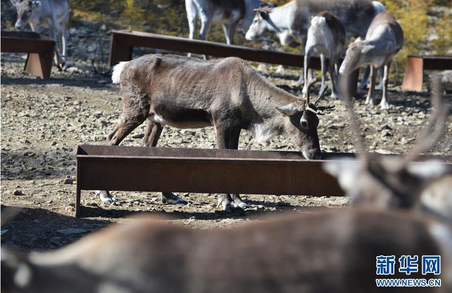 9月18日,一头驯鹿在内蒙古大兴安岭根河林业局约安里林场吃饲料。新华社记者邹予摄