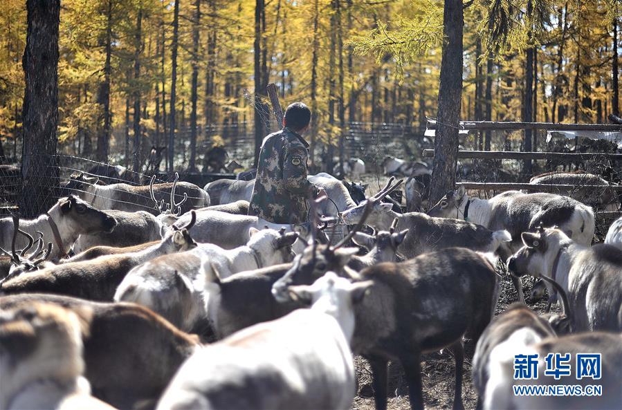 9月18日,在内蒙古大兴安岭根河林业局约安里林场,林场职工张国华要为驯鹿补充饲料。