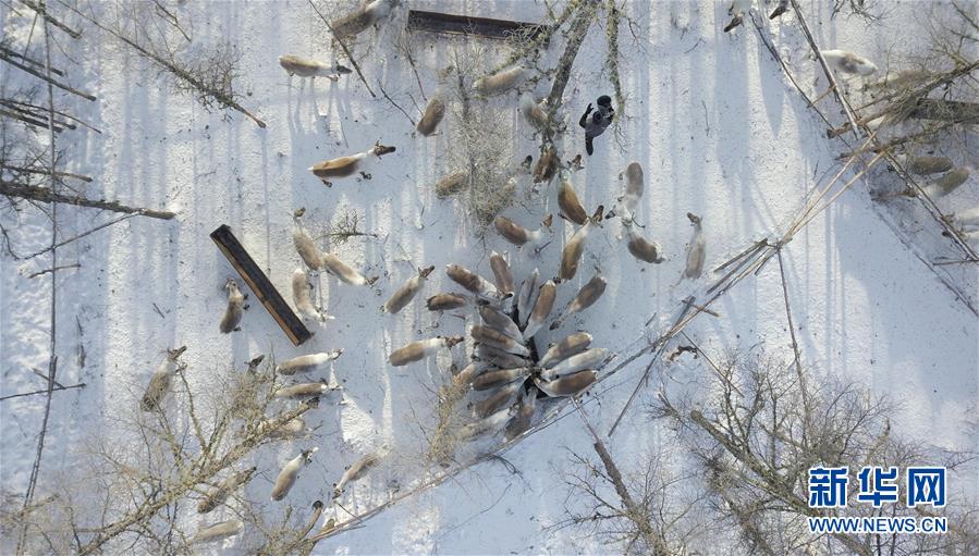 在内蒙古大兴安岭根河林业局约安里林场,林场职工张国华在鹿圈补充饲料(2017年12月23日无人机拍摄)。新华社记者李任滋摄