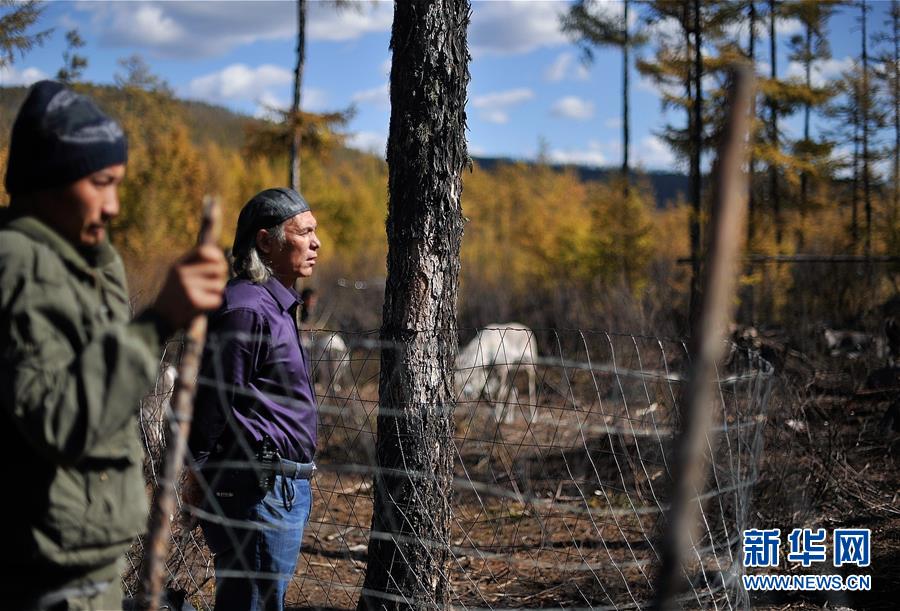 9月18日,在内蒙古大兴安岭根河林业局约安里林场,根河市敖鲁古雅乡兽医站站长古革军(右)在鹿圈查看驯鹿。新华社记者于洋摄