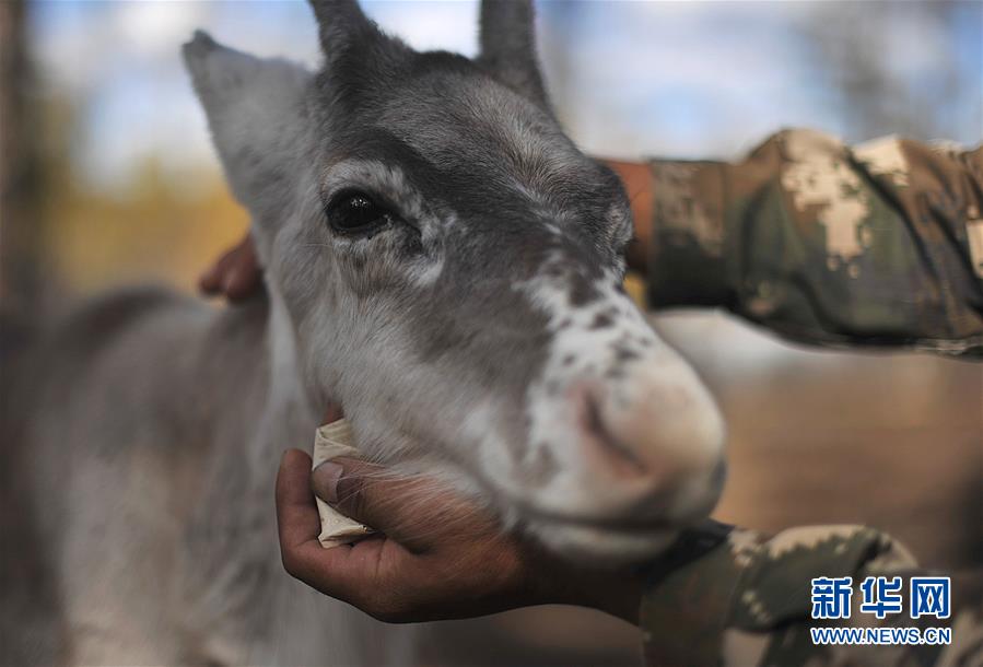9月18日,在内蒙古大兴安岭根河林业局约安里林场,林场职工张国华爱抚着驯鹿“混血宝宝”。新华社记者于洋摄
