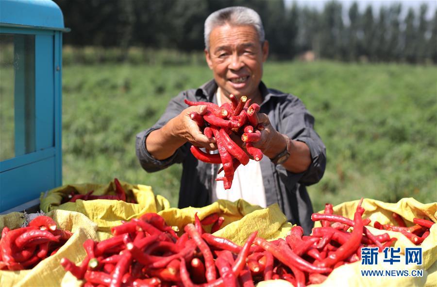 9月16日,阜城县王集乡南张庄村农民在展示采摘的辣椒。近年来,河北省阜城县王集乡在推进产业富民过程中,积极引导农民调整农业产业结构,按照品种特色化、种植规模化、产销一体化的“公司+基地+农户”的经营模式,鼓励农民发展特色辣椒种植,推行“订单种植”模式,开辟出了一条农民创收新路径。目前,阜城县王集乡辣椒种植面积3100余亩,每亩年收益2500元以上,带动当地农民实现增收。新华社记者朱旭东摄