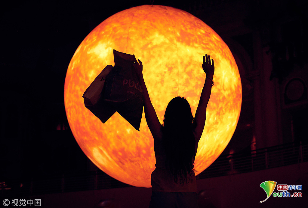 当地时间2018年9月18日,英国曼切斯特,顾客们在特拉福德购物中心的一个巨型的“太阳”下享受室内日光浴,感受英国未完的史上最热夏天。这个人造“太阳”的亮度相当于1.2万个灯泡。图片来源:视觉中国