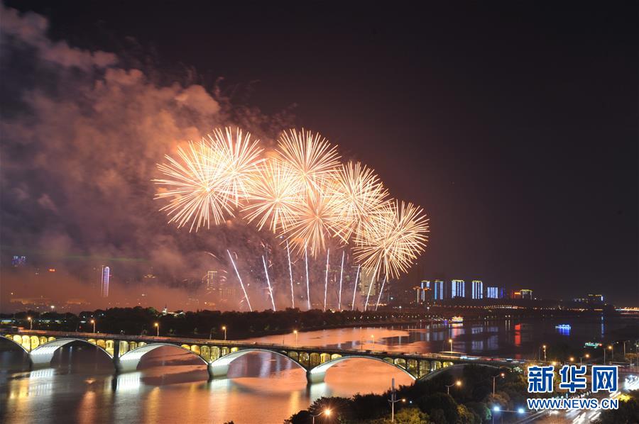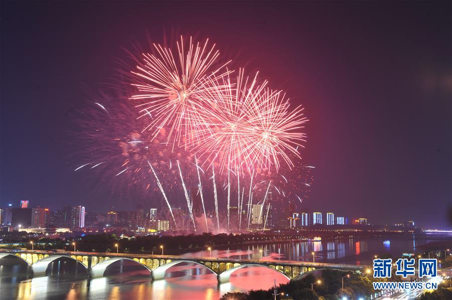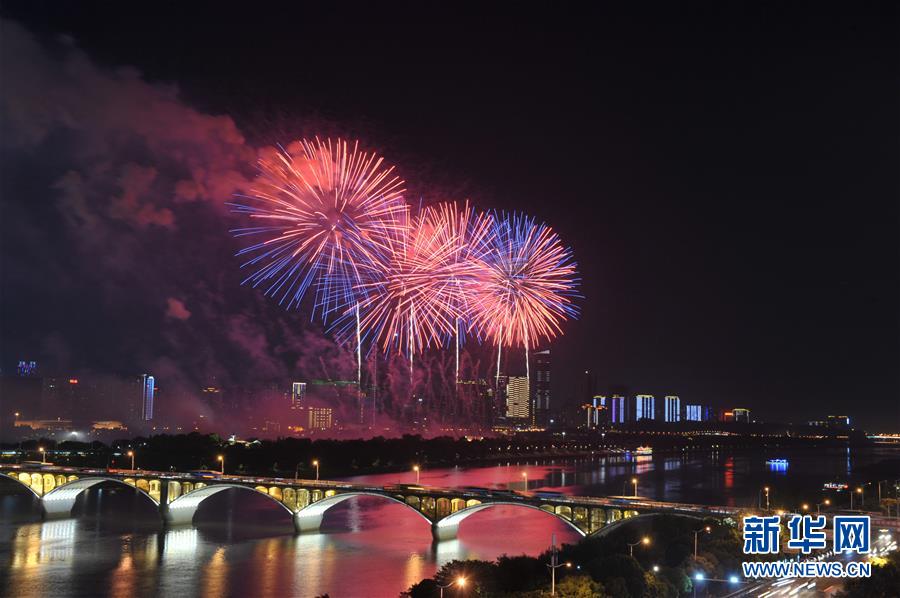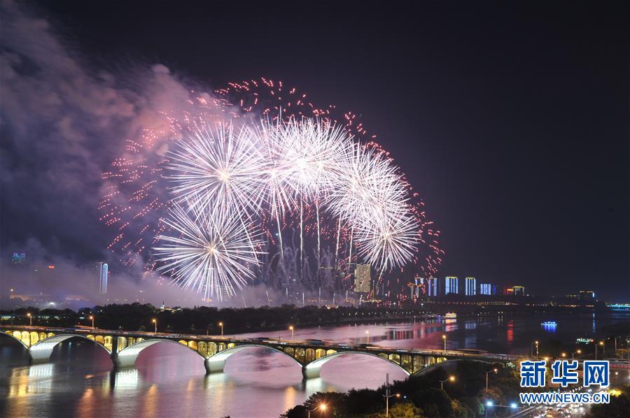 9月19日晚,湖南省长沙市在湘江橘子洲举办焰火晚会,绚丽的焰火与湘江两岸的城市夜景交相辉映。