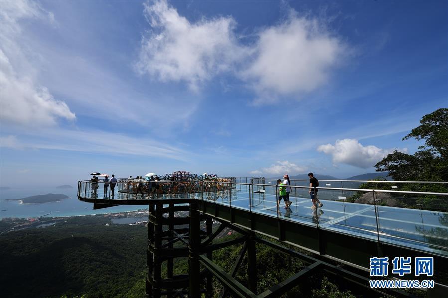 8月31日,游客在玻璃观景平台上参观游览。近日,位于海南省三亚市亚龙湾热带天堂森林公园的大佛石全海景玻璃栈道开始正式营业。凌空而建的玻璃栈道全长400米,游客可将亚龙湾的美景尽收眼底。新华社记者郭程摄