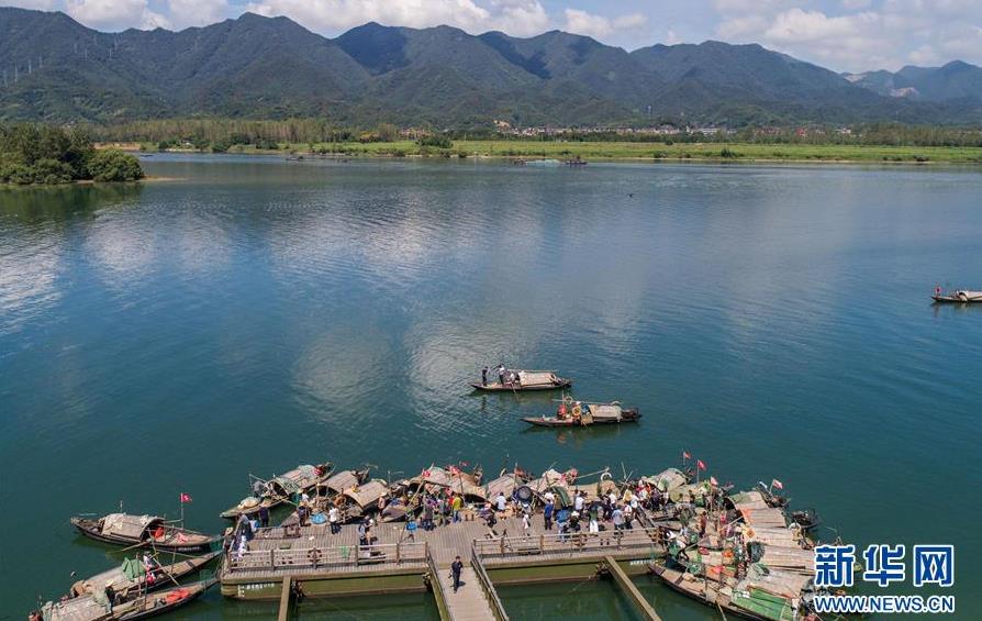 9月18日,渔船陆续从码头出发,行驶到富春江里捕捞江鲜(无人机拍摄)。
