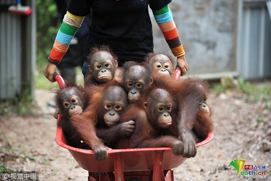 印尼动物救援中心里 猩猩宝宝挤“校车”“上学”超萌
