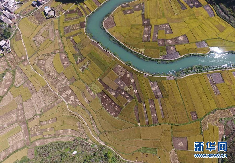 这是广南县八宝镇坝龙村的稻田景色(9月20日无人机拍摄)。 云南省文山壮族苗族自治州广南县八宝镇今年种植优质水稻22000余亩,秋收季节,田野里一片金黄,景色如画。 新华社记者杨宗友摄