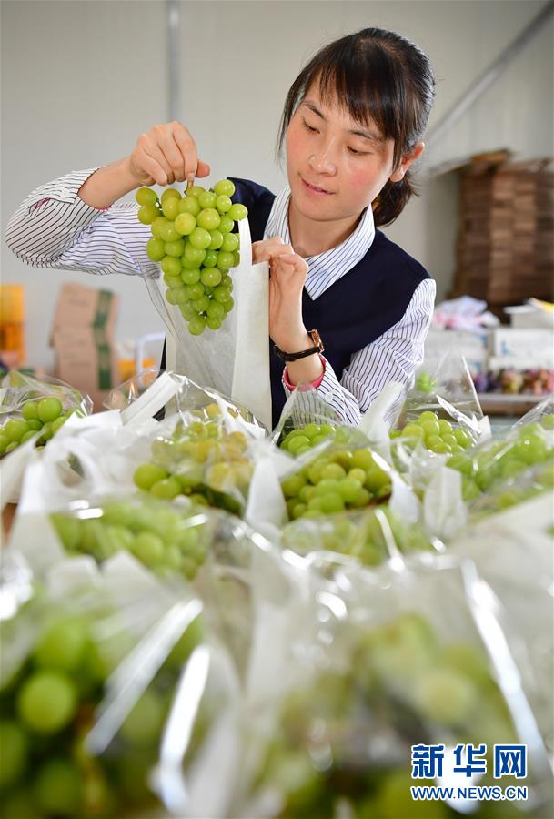 9月21日,杨凌锦田果蔬专业合作社的工作人员将刚采摘下来的葡萄装袋。