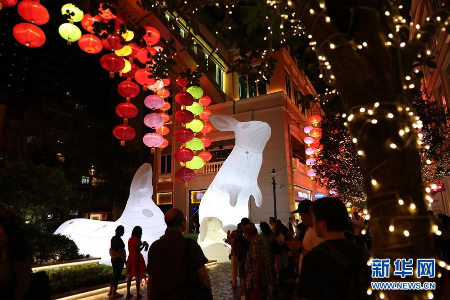 9月21日,彩色灯笼和“月兔”花灯装扮香港利东街夜景。中秋节临近,香港喜庆气氛日浓。新华社记者吴晓初摄