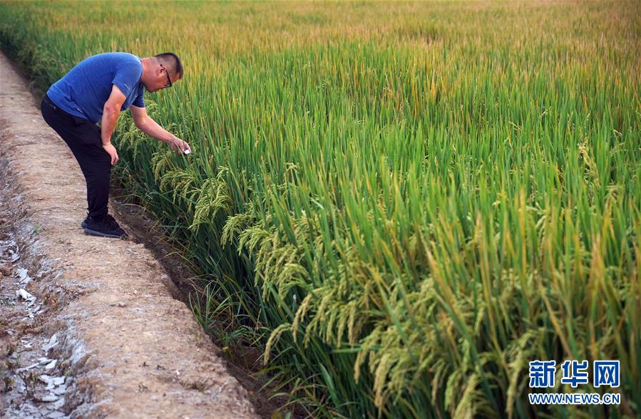 9月15日,北大荒集团七星农场驻小岗村技术负责人赵明武在小岗村的北大荒集团现代化水稻生产基地检查生物杀虫卡。新华社记者才扬摄