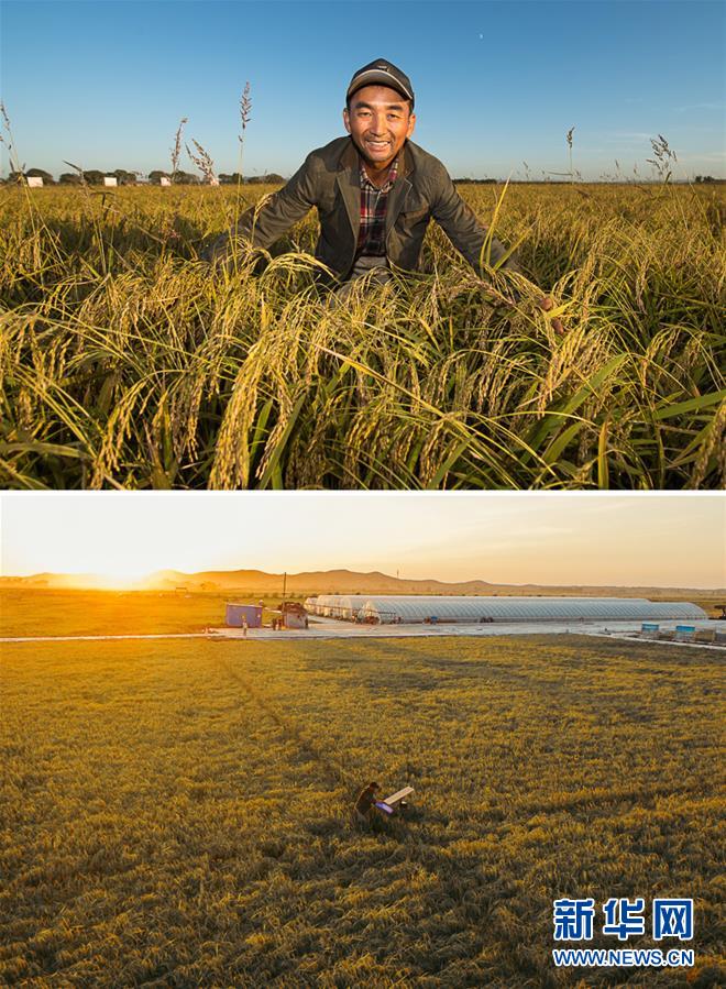 这张拼版照片显示的是:上图,9月18日,在吉林省舒兰市平安镇金星村,有机水稻种植户李学明站在稻田里;下图,9月18日,李学明在清理稻田间设置的太阳能物理灭虫器(无人机拍摄)。 新华社记者许畅摄