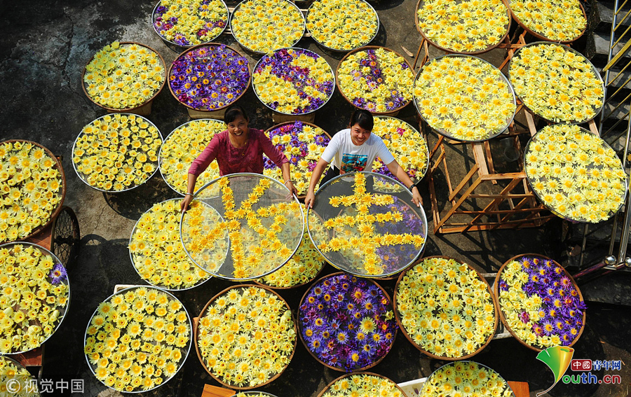 2018年9月23日,广西柳州,柳北区石碑坪镇下陶村的农民覃向鲜和邻居一起用已经晾晒干了的九品香莲摆出“丰收“字样。图片作者:陈健明
