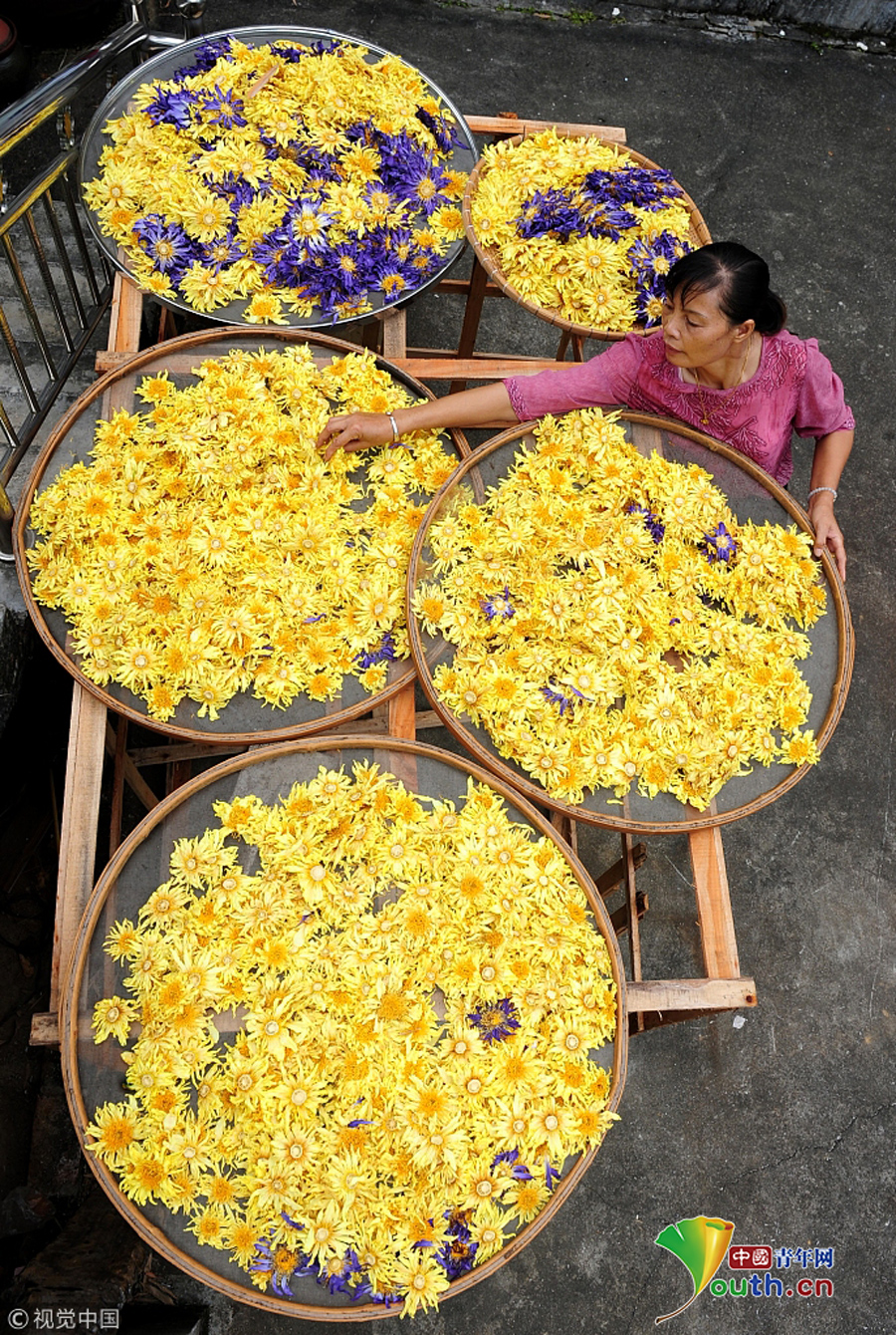 2018年9月23日,广西柳州,柳北区石碑坪镇下陶村的农民覃向鲜在晾晒九品香莲。图片作者:陈健明