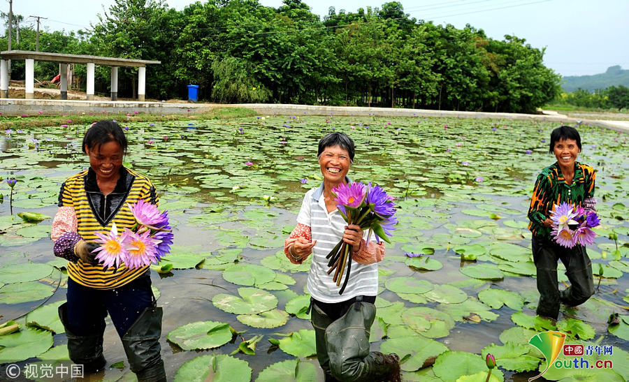 柳州50多亩九品香莲大获丰收 农民喜悦采收