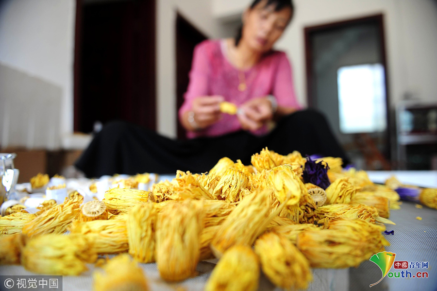 2018年9月23日,广西柳州,柳北区石碑坪镇下陶村的农民覃向鲜在分拣已经晾晒干了的九品香莲。图片作者:陈健明