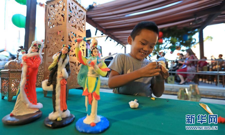 9月23日,在美国科斯塔梅萨南岸广场,一名儿童在中秋游园会上学习捏面人。 美国西部最大购物中心南岸广场23日晚举办游园会,庆祝中国传统节日中秋节。 新华社记者李颖摄